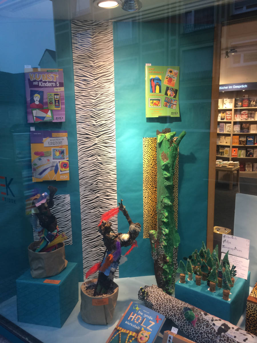Im Schaufenster der Buchhandlung Beidek standen ganz besondere Gestalten: Die Klasse 3 hatte alte Rebstöcken wieder lebendig gemacht. Wer genau hinschaut kann eine Braut, einen Piraten, einen Fuchs, einen Elefanten, einen Mädchenfrosch, einen Maulwurf und einen Igel erkennen.