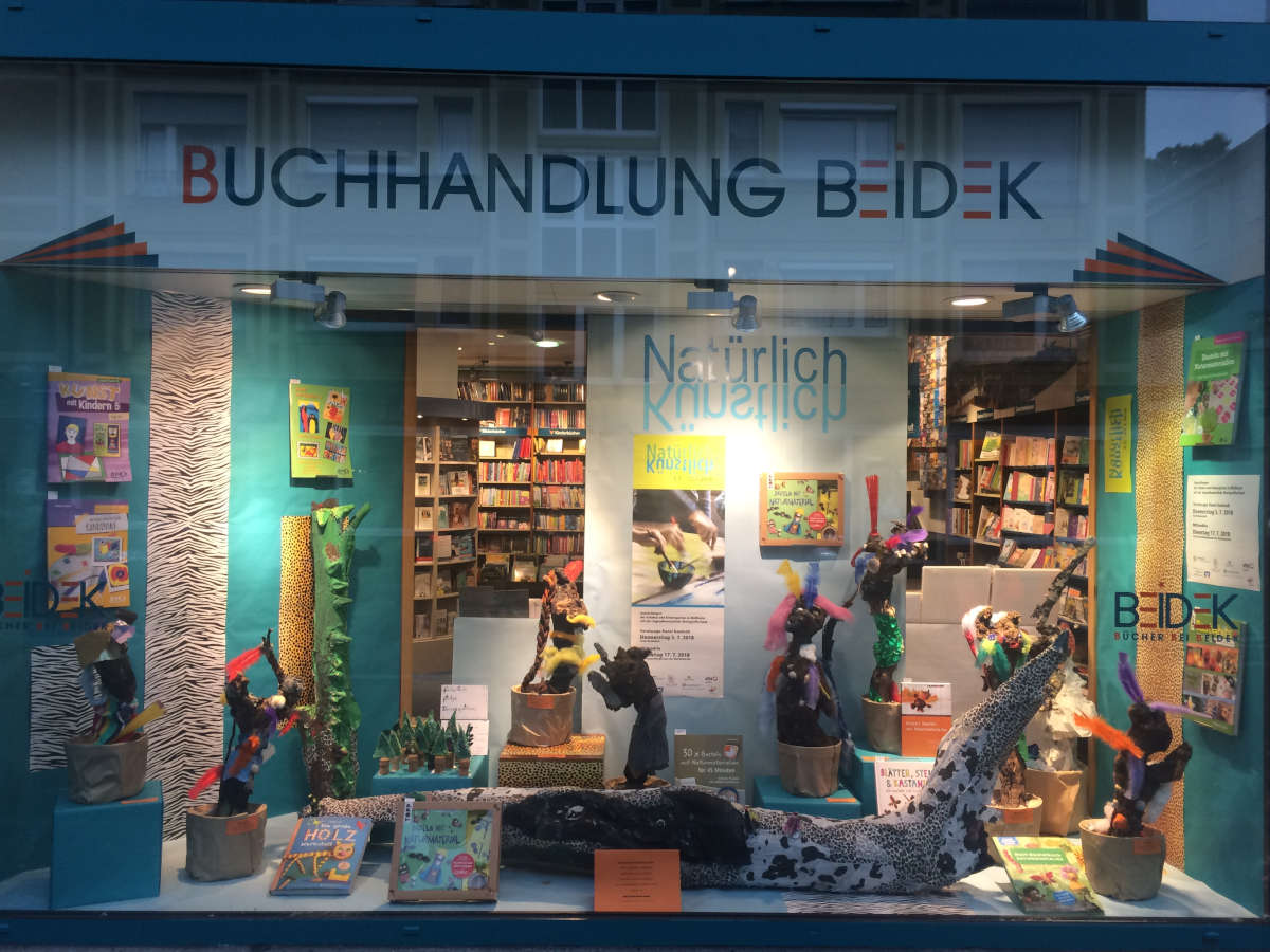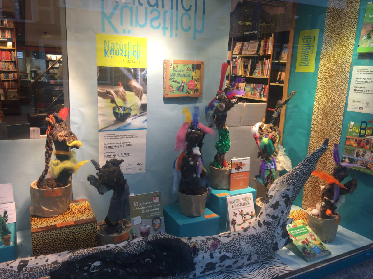 Im Schaufenster der Buchhandlung Beidek standen ganz besondere Gestalten: Die Klasse 3 hatte alte Rebstöcken wieder lebendig gemacht. Wer genau hinschaut kann eine Braut, einen Piraten, einen Fuchs, einen Elefanten, einen Mädchenfrosch, einen Maulwurf und einen Igel erkennen.